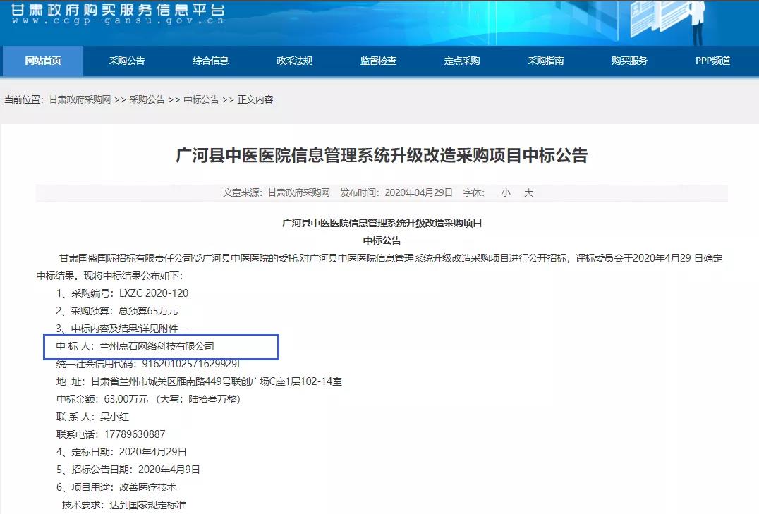 2020年4月29日,蘭州點石網絡科技有限公司在“廣河縣中醫(yī)醫(yī)院信息管理系統升級改造采購項目”的競標中,憑借過硬的產品質量、扎實高效的工作作風、強大的技術實力以及良好的企業(yè)信譽以絕對的優(yōu)勢順利中標。
